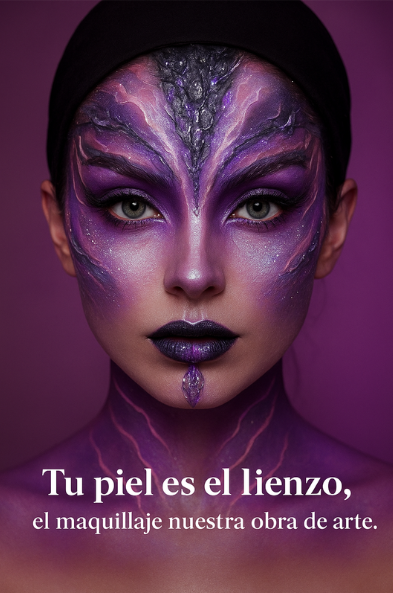 Prompt: Necesito hacer un publicidad de maquillaje, con la figura retórica metáfora, o sea haz la publicidad mostrando como que nuestro es un lienzo como la imagen con fondo y tonalidades violetas con mucha calidad.